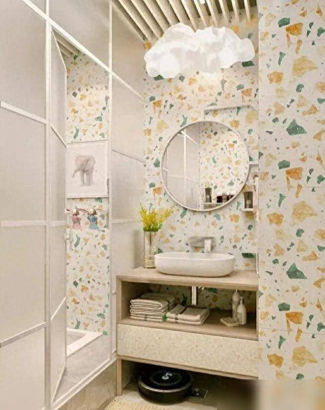 去年装修时选「莫兰迪彩色水磨石砖」(浅灰调加一点点粉/蓝颗粒),铺出来简直像给厕所加滤镜—既有质感又不艳俗!